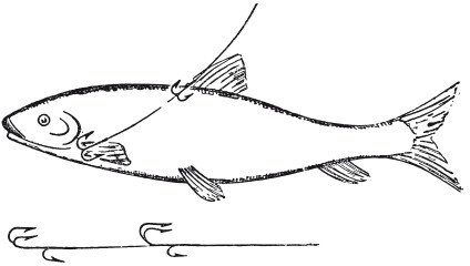 Об ужении на живую рыбку тоже не стоит особенно распространяться. Живцом могут быть гольян, пескарик и голец, иногда подкаменщик. Лучше всех гольян, который хотя и не так крепко сидит и не так долго живет на крючке, но бойчее ходит и не забивается под камни, как прочие. Местами форель недурно берет на небольшую уклейку, но последняя очень хлипка и гораздо скорее снет, чем гольянчик. Насаживают большей частью за губу, на одиночный крючок № 1–4, привязанный к крепкому, но нетолстому жилковому поводку на карабинчике. Иногда, при неверном клеве в особенности, употребляют Джардиновскую снасточку с двумя двойниками и добавочными третьими крючками. Ловят на живца почти всегда с катушкой, и удилище должно быть довольно жестко, а шнурок толще, чем при ловле на червя, тем более на мушку.