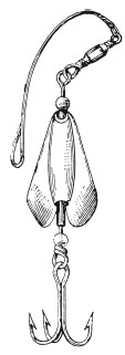 Удилище для этой ловли делается довольно длинное, двуручное и не очень гибкое, с стоячими кольцами и катушкой с 35–50 м крепкого непромокаемого шелкового шнура средней толщины. К шнуру привязывается подлесок (трэс) метра в полтора из жилок, с карабинчиками, а к шнуру – искусственная рыбка на басковом поводке, хорошо оснащенная 2–3 якорьками. Лучшими рыбками считают сделанные из гуттаперчевой клеенки, более прочные и тяжелые, чем шелковые, скоро изнашивающиеся от зубов щуки, но на глубоких местах, вероятно, будут пригодны и полые металлические, с раструбами, употребляемые для ловли шересперов со шлюзов (см. ШЕРЕСПЕР). Можно, впрочем, надевать надлежсащий груз на поводок. Цвет и размер рыбки зависят от местных условий, но общее правило: чем вода мутнее, тем рыбка должна быть виднее, т. е. более блестящей. Главное условие, чтобы она безукоризненно вертелась в воде, не закручивая лески.