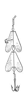 Те же самые искусственные рыбки могут быть употребляемы для ловли плавом, как и обыкновенная дорожка, о которой уже говорилось мною выше (см. ТАЙМЕНЬ). Дорожка всего пригоднее для озер; форма ее бывает весьма различна – от простой изогнутой пластинки до самой затейливой, английского изделия. Для дорожки годится почти всякая блесна… Из заграничных самые лучшие имеют вид ложки и треугольника и должны быть довольно массивны. Для того, чтобы ходовая блесна правильно играла и не закручивала лесы, необходимы по меньшей мере два карабинчика; только недавно изобретенная дорожка двойного действия (рис. 57) не имеет недостатка, общего всем ходовым блеснам. Она состоит из стержня, на котором вращаются две пластинки с загнутыми лопастями, так что одна вертится при поступательном движении вправо, другая влево. Это достигается тем, что у передней пластинки правая лопасть загнута, положим, вправо, а левая влево, а у задней – наоборот.