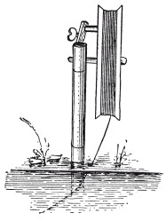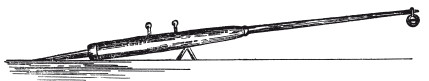 Для ловли с берега во Франции употребляется большей частью приспособление вроде жерлицы, представляющее те же выгоды, так как рыба не может наколоться на крючок и, не чувствуя сопротивления, редко бросает насадку, что случается очень часто при ужении на несколько удильников. Приспособление это совершенно понятно из прилагаемого рисунка: когда рыба, взяв насадку, потянет за лесу, то плоская катушка, на которую она намотана, поворачивается, ударяет шпеньком по пружинке с бубенчиком, прикрепленной к ножке снаряда, и продолжает разматываться, давая рыбе возможность беспрепятственно удаляться с насадкой и при каждом обороте позванивая бубенчиком. В Англии для ловли со дна на глубоких местах употребляется удилище с катушкой, какое употребляется для ужения с поплавком; разумеется, степень гибкости верхушки удилища должна соответствовать силе течения и зависящей от нее тяжести грузила. Последнее большей частью просверлено и бывает круглое (при легком течении) или плоское (при сильном); крючок обыкновенно привязан к леске из жилок сантиметра в 92 длины, с дробинкой, прищипнутой в 61 см от крючка и не дающей грузилу съезжать дальше. Эта леска пристегивается к тонкому непромокаемому шнурку.