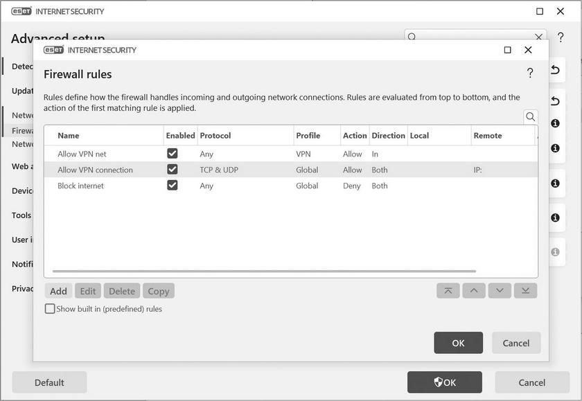 2. Дальше создаете 3 правила в разделе Rules. Одна правило для профиля Global – блокировать весь интернет; следующее правило – разрешить подключение (TCP или UDP) к IP-адресу VPN-сервера; и последнее, третье правило – разрешить все протоколы на профиле VPN.