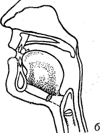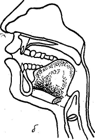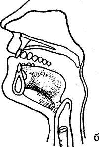 Рис. 10. Артикуляция Ф, В: а — снаружи; б — внутри.