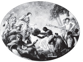 У де Витте африканец, стоя на коленях, показывает своему хозяину написанную маслом картину. На картине изображен замок, возвышающийся над одним из главных центров работорговли в Западной Африке.