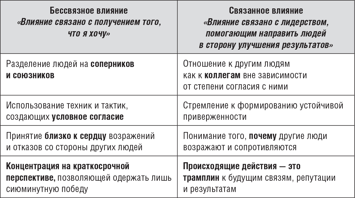 • Связанное влияние предполагает открытость и прозрачность всего, что вы делаете. Оно не допускает использования тайных тактик и техник, благодаря которым вы надеетесь получить некие невидимые на первый взгляд дивиденды.