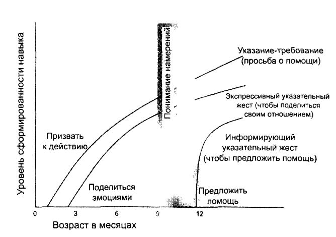 Рис. 4.1. Возникновение кооперативной коммуникации и указательного жеста в онтогенезе