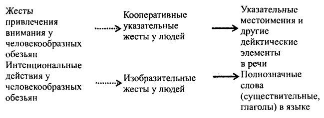 Итак, наш главный итог заключается в том, что мы можем описать эволюционную последовательность, в которой мы переходим от (1) совместных действий к (2) основанной на действиях «естественной» кооперативной коммуникации, которая сначала протекает в контексте совместной деятельности, а затем и вне ее, и, наконец, к (3) конвенциональной коммуникации, причем последний переход, возможно, происходит за счет того, что некоторые формы естественной коммуникации, появившиеся на двух предыдущих этапах, начали становиться конвенциональными (и поэтому отчасти произвольно выбираемыми) и также обеспечили фундамент для построения голосовых конвенций, выбираемых совершенно произвольно.