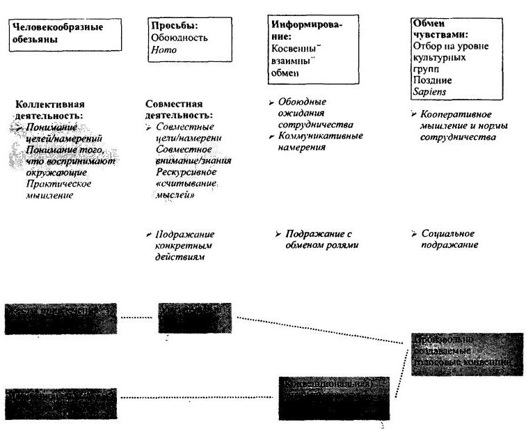В соответствии с описанными в главе 5 данными, через некоторое время после того, как эволюционное развитие человека пошло своим отдельным путем (этап «Homo» на рис 5.1), люди обрели способность к взаимовыгодному сотрудничеству. Это способствовало формированию структуры совместного внимания и совместных знаний (common ground), в рамках которых они могли просить окружающих о чем-либо более искусным образом, нежели, например, человекообразные обезьяны просят жестом людей; и реципиенты, вероятно, удовлетворяли эти просьбы. На этом этапе люди также владели некоторыми навыками подражания, и поэтому некоторые их телодвижения, выражающие намерение (intention-movements), также могли быть результатом социального научения. Но, в рамках нашей гипотезы, на этом этапе эволюционного развития человеческая коммуникация не была еще полностью кооперативной: люди умели просить, но не информировать другого о чем-либо; таким образом, не существовало непрямых, кооперативных просьб сделать что-то, удаленное во времени и пространстве от момента самой просьбы (что доступно существам, обладающим настоящей речью).