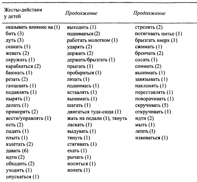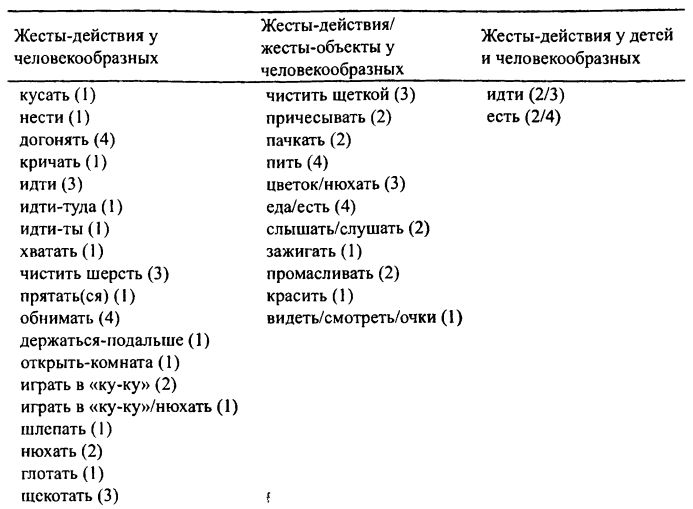 Жесты-действия, применяемые детьми, пользующимися «домашними» системами жестовой коммуникации (Goldin-Meadow, Mylander 1984), человекообразными обезьянами и представителями обеих этих групп (количество показавших тот или иной жест — из общего числа 6 в каждой группе — указано в круглых скобках)[22]. (Спасибо Эстебану Ривасу за помощь в составлении списка по шимпанзе.)