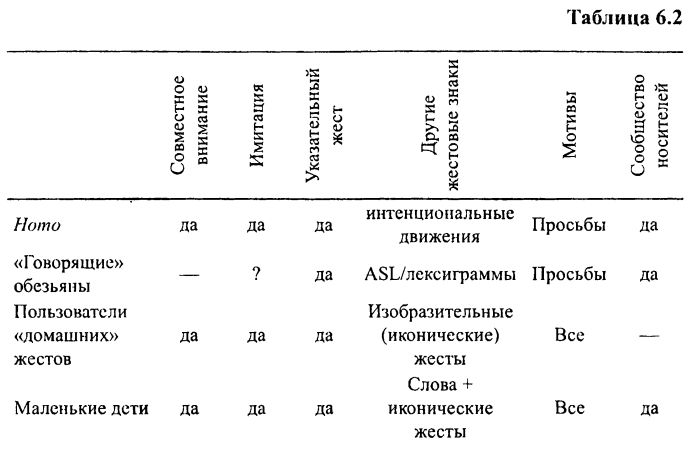 Если говорить об эволюционном развитии, ни одна из ситуаций, разбиравшихся нами выше (кроме естественной коммуникации человекообразных), не характерна для ранних стадий эволюции человека. «Говорящие» обезьяны растут в современных условиях рядом с людьми, а все маленькие дети обладают когнитивными возможностями, которых у древних людей, вероятнее всего, не было, в особенности — навыков воспроизведения смены ролей и навыков совместных намерений. Так что наша модель первых этапов эволюции грамматики должна представлять собой некое сочетание этих различных ситуаций (кратко охарактеризованных в табл. 6.2). Коммуникативные средства, которые наш воображаемый Homo мог бы в то время иметь для того, чтобы произвести это потенциальное сочетание (см. главу 5), — это указательный жест и конвенционализированные интенциональные движения (conventionalized intention-movements), поскольку полноценные иконические жесты предполагают возникновение коммуникативного намерения (см. раздел 5.2.2).