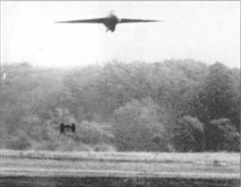 Тележка сброшена!.. «Комета» набирает высоту. Если присмотреться, то хорошо видно, что испытательный аэродром имеет довольно ограниченные размеры, причём чуть ли не вплотную к ВПП примыкает лес, что не повышает безопасность вылетов, тем более на таких аппаратах, как Me 163…
