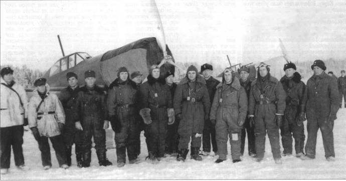 Летно-технический состав отряда Луукканена вскоре после прибытия в Вяртсиля. Пятеро пилотов группы стоят впереди в летных шлемах, первый справа будущий финский ас № 1 сержант И.Юутилайнен, четвертый — сам Луукканен. Из этой пятерки все отметятся победами в Зимней войне, но двое до её конца не доживут.