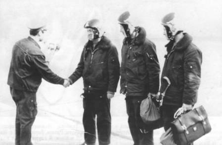 Командир 341-го ТБАП подполковник Демидов, поздравляет перед строем полка экипаж майора А.И.Чупина с прямым попаданием в цель. Рядом с командиром штурман В.И.Селезнёв и оператор I5.ЕДавыдов. В одном из букетов цветов спрятана бутылка коньяка. Аэродром Озёрное, лето 1981 г.
