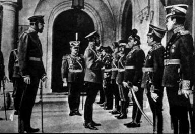 Императору Николаю II представляются первые военные лётчики России. На фото хорошо видно, что единой формы для авиаторов ещё не существует и каждый одет в парадный мундир своего полка. Судя по обмундированию (этой группы), наибольший интерес к полётам проявили отчаянные рубаки-кавалеристы.