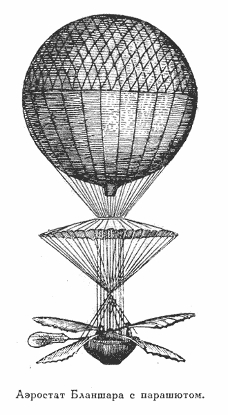 Человек, поднимавшийся на воздушном шаре, должен иметь спасательное средство, чтобы избежать гибели, подобной гибели Пилатра де-Розье и Ромена. Таким средством мог быть только парашют. Многие стали думать над тем, как бы приспособить парашют к полетам на воздушном шаре. Но только двенадцать лет спустя французский воздухоплаватель Гарнерен построил удобный воздухоплавательный парашют. Это был мягкий парашют, без каркаса и спиц. Он подвешивался сбоку баллона воздушного шара.