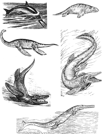 РИСУНОК 42. Мезозойские морские рептилии: эвриапсиды (а-г) и диапсиды (д-е). (а) – ихтиозавр, (б) – плакодонт, (в) – плезиозавр-эласмозавр, (г) – плезиозавр-плиозавр, (д) – мозозавр, (е) – морской крокодил.