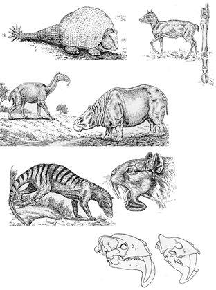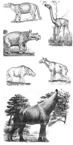 73 «Южноамериканские копытные» – шесть вымерших отрядов, эндемичных для этого материка. Все они, как и наши парнокопытные и непарнокопытные, ведут происхождение от кондиляртр, однако с позднего мела развивались в изоляции, и сходство с различными «северными» группами приобрели независимо, то есть чисто конвергентно.