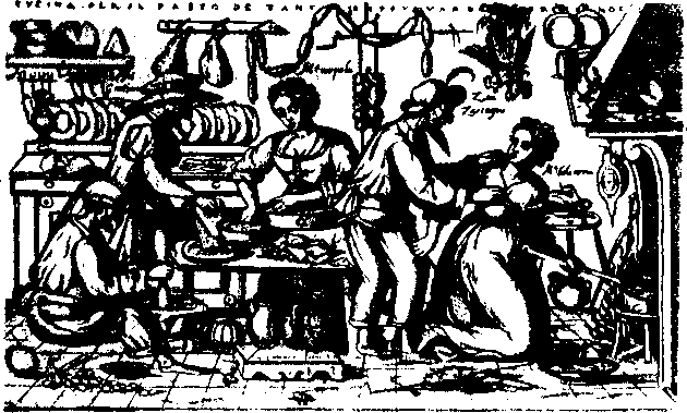 Сцена на кухне с Доктором Грациано. Французская гравюра XVI в.