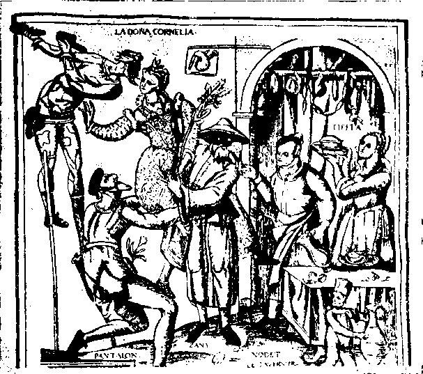 Сцена из комедии дель арте. Французская гравюра XVI в.