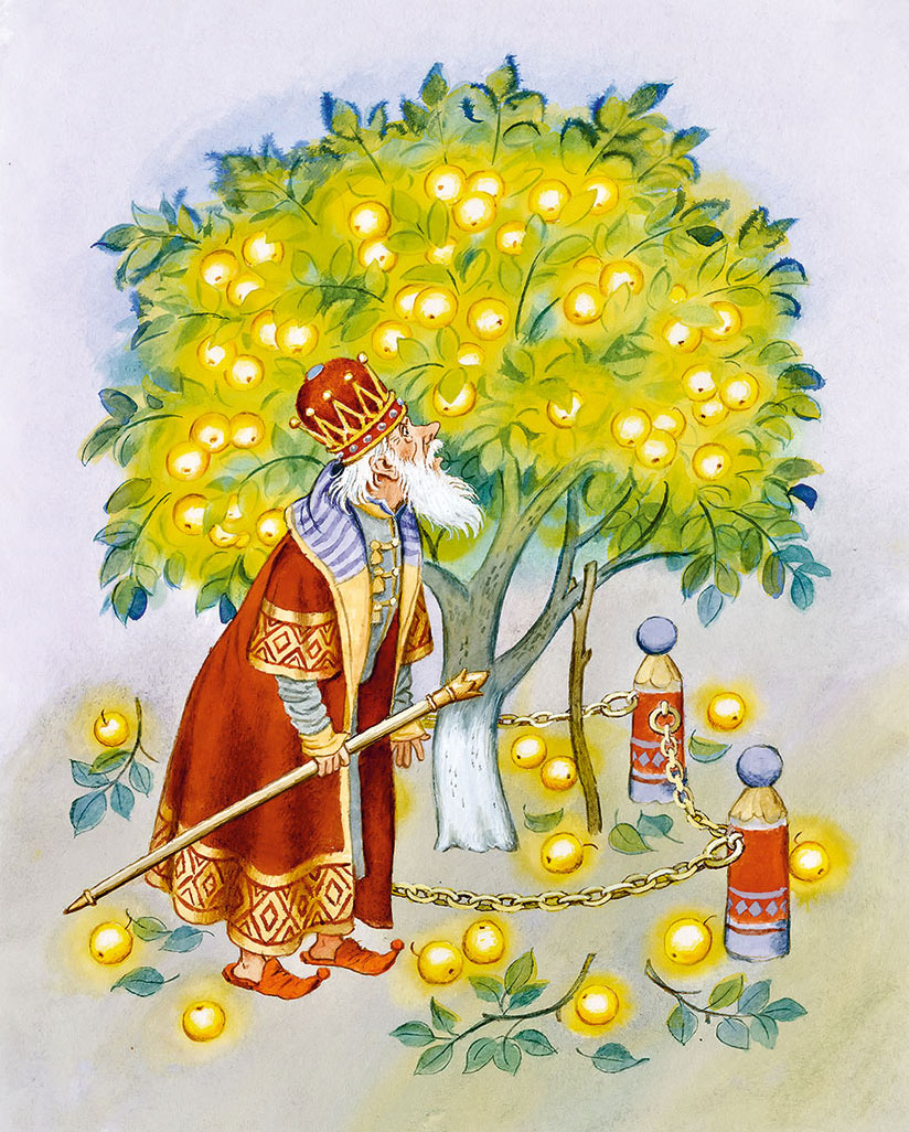 Жил-был царь Берендей, у него было три сына, младшего звали Иваном. И был у царя сад великолепный; росла в том саду яблоня с золотыми яблоками.