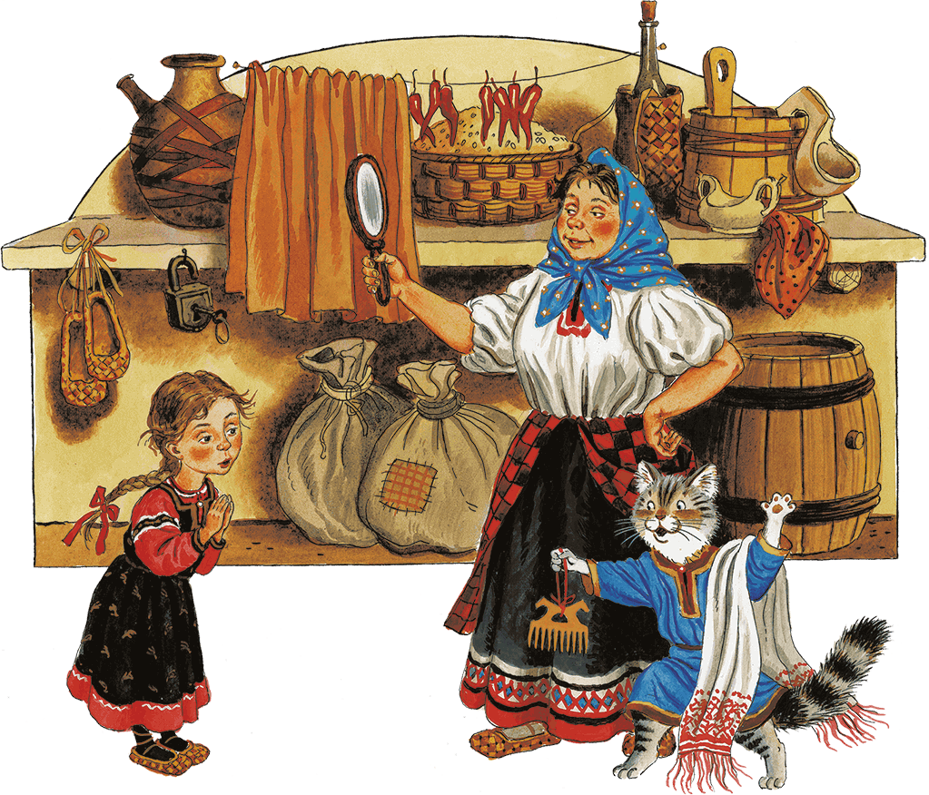 А кот сел за кросна и ткёт: не столько наткал, сколько напутал. Баба-яга подошла к окну и спрашивает: