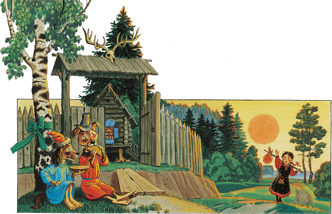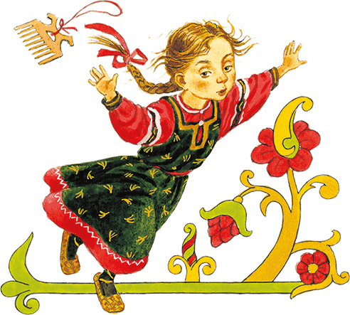 Девочка взяла полотенце и гребешок и побежала. Собаки хотели её рвать, она бросила им хлебца, и они её пропустили. Ворота хотели захлопнуться, она подлила им под пяточки маслица, и они её пропустили. Берёзка хотела ей глаза выстегать, она её ленточкой перевязала, и та её пропустила.