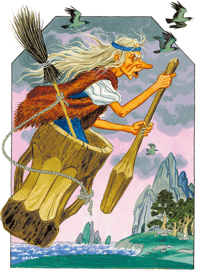 Баба-яга, костяная нога, поскорее села в ступу, толкачом погоняет, помелом след заметает и пустилась в погоню за девочкой.