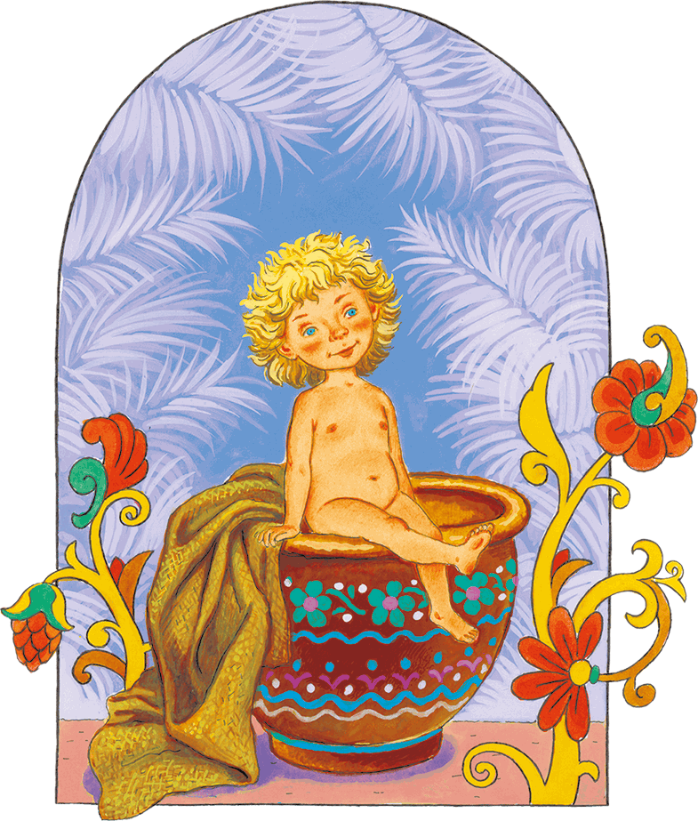 Однако старик принёс комочек снегу в избу, положил в горшочек, накрыл ветошкой и поставил на окошко. Взошло солнышко, пригрело горшочек, и снег стал таять. Вот и слышат старики – пищит что-то в горшочке под ветошкой; они к окну – глядь, а в горшочке лежит девочка, беленькая, как снежок, и кругленькая, как комок, и говорит им: