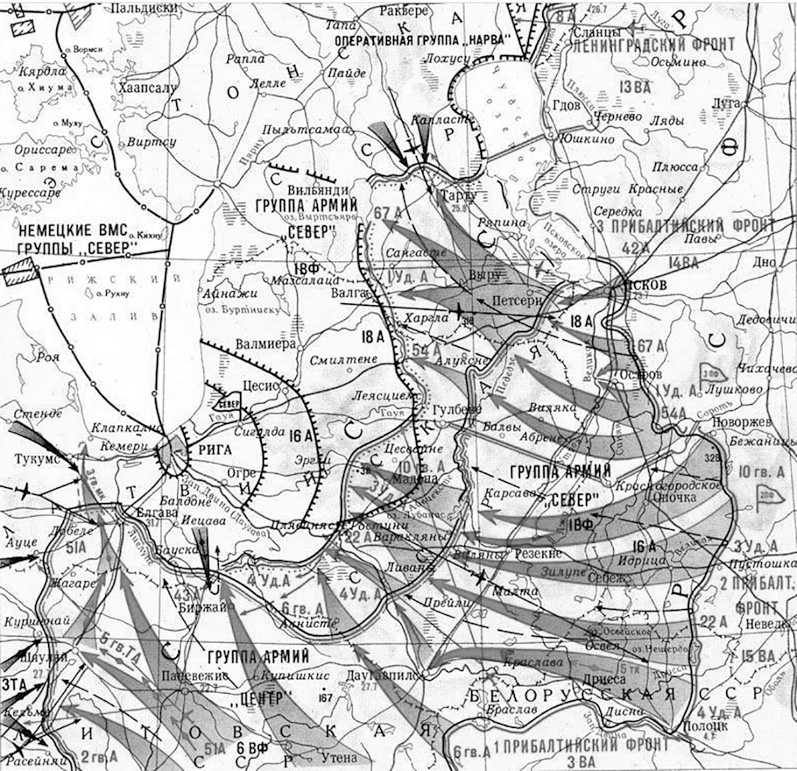 Предполагался и иной вариант: улучшить положение ленинградцев за счет расширения к северу полосы 2-го Прибалтийского фронта. Но мы уже имели такой опыт. Он тоже не оправдал себя, поскольку Псковско-Островской район представлял самостоятельное целое. Расположенная здесь группировка противника сильно укрепилась и седлала, по существу, три операционных направления: к северу – на Тарту, на Алуксне, Валгу и к западу – на Алуксне, Тесис, Ригу. 2-му Прибалтийскому фронту такая дополнительная нагрузка была явно не по плечу. Она неминуемо вела к распылению его усилий и отнюдь не улучшала управление войсками» (9, с. 200).