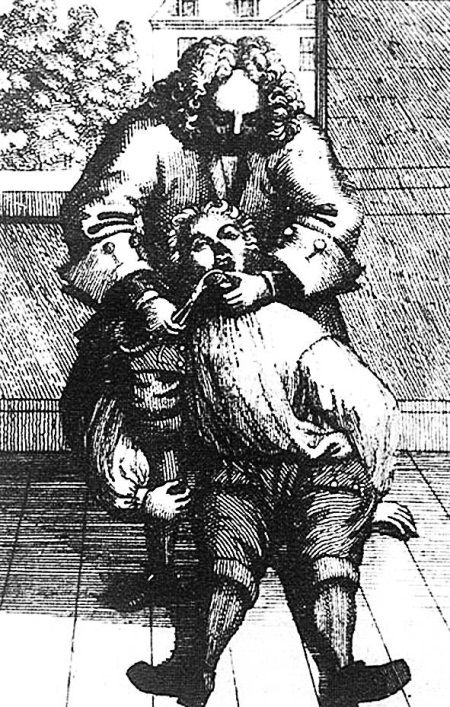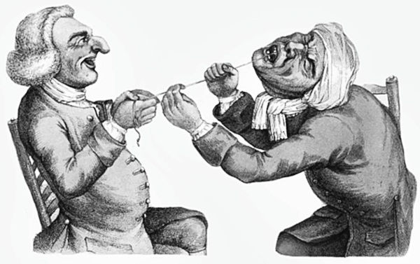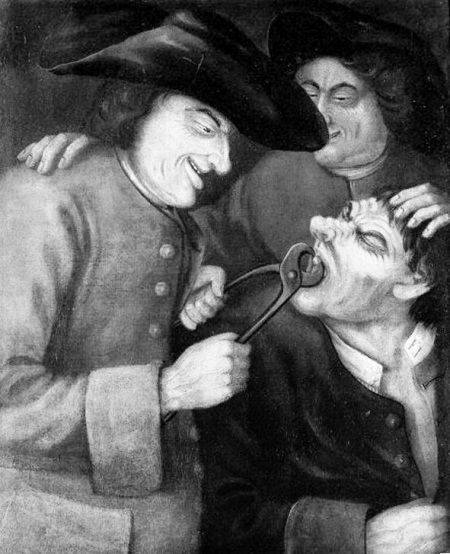 В XVIII в. считалось, что во время удаления зубов пациент должен сидеть на полу, находясь ниже стоматолога. Людвиг Крон работает с пациентом в таком положении (рисунок из его книги «Кровопускание и вырывание зубов»)