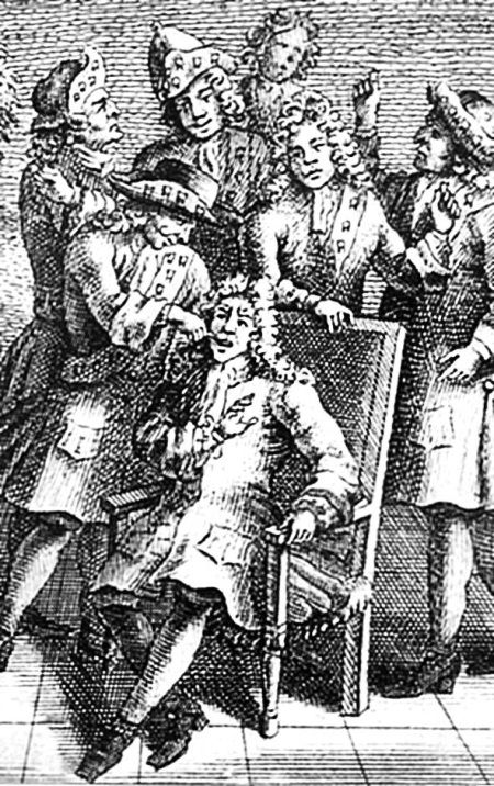 Карикатура на зубных врачей. XVIII в. Раскрашенная гравюра