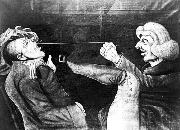 Французский стоматолог удаляет зуб дворянину, сидящему в кресле. С аристократическим хладнокровием пациент не хватается ни за зубного врача, ни даже за ручку кресла, но жест его правой руки свидетельствует об умеренной боли
