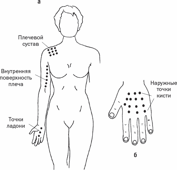Чтобы снять зажимы в плечевом поясе, надавливайте на точки в области плечевого сустава, внутренней поверхности плеча (рис. 24, а) и наружной поверхности плеча.