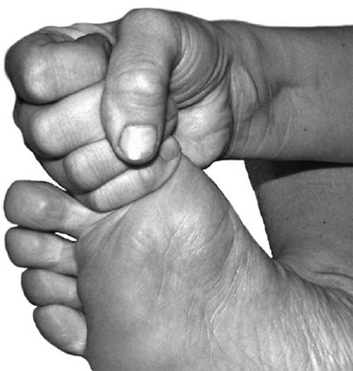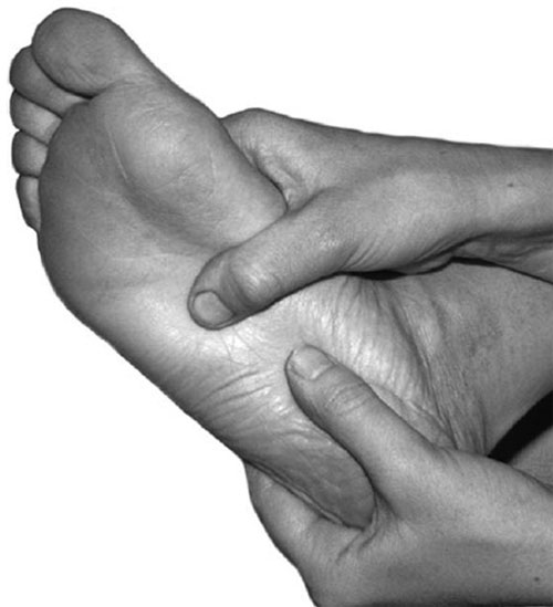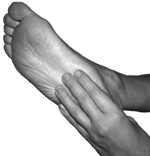 3. Захватываем пятку следующим образом: ладонь располагается сзади, большой палец направлен на голень, четыре пальца располагаются вдоль подошвенной части ступни (фото 11, б). Вдавливаем подушечки пальцев в свод подошвенной части. Не уменьшая силы вдавливания, начинаем двигать четырьмя пальцами вперед назад между пяткой и сводом. Хорошо разминаем и растираем всю подошву.