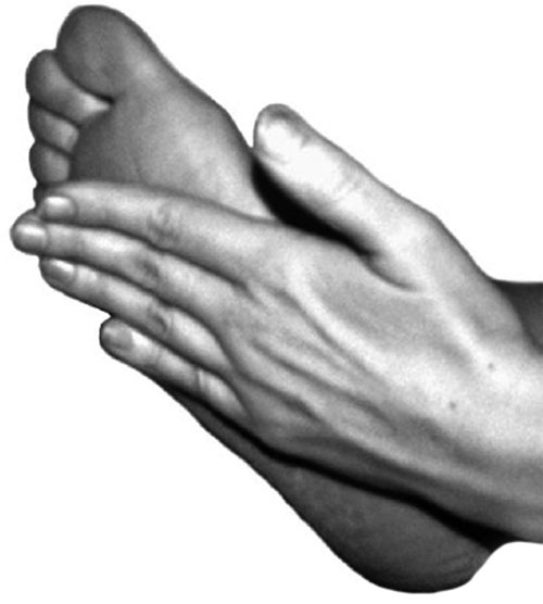 2. Двумя руками захватываем стопы. Большие пальцы располагаем на подошвенной части, а ладони на подъемах ступней (фото 11,