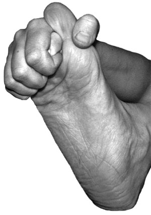 5. Разминая и растирая стопы, добьемся их хорошего разогрева и податливости связок. После этого можно безбоязненно «похрустеть» суставами. Беремся ладонью за пальцы, растираем пальцы от кончиков к основанию. Затем самостоятельно подгибаем несколько раз все пальцы. После чего продолжаем подгибание четырех пальцев (без большого пальца) принудительно, ладонью (фото 11, г). Резко вытягиваем вперед ладонь и сгибаем вниз в запястье. Вместе с ладонью сгибаются пальцы ноги. Выполняйте сгибание на выдохе, чтобы все мышцы были расслаблены.