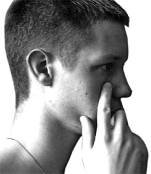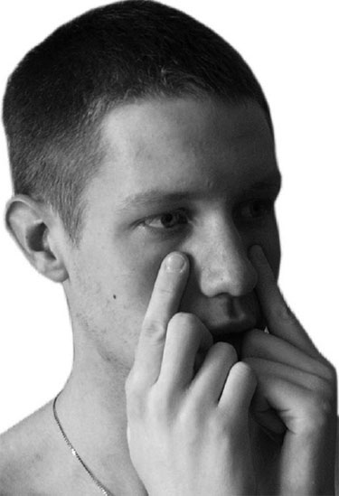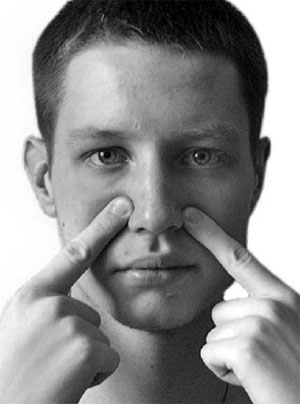2. Средние пальцы руки поместите на кончики указательного пальца и надавите на точки у крыльев носа (которые показаны на фото 17, г). Такой способ усилит степень давления и эффективность лечения.