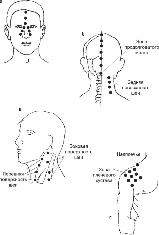 2. Проработайте все точки затылочной области (рис. 36, б) и плечевого пояса (рис. 36, г).