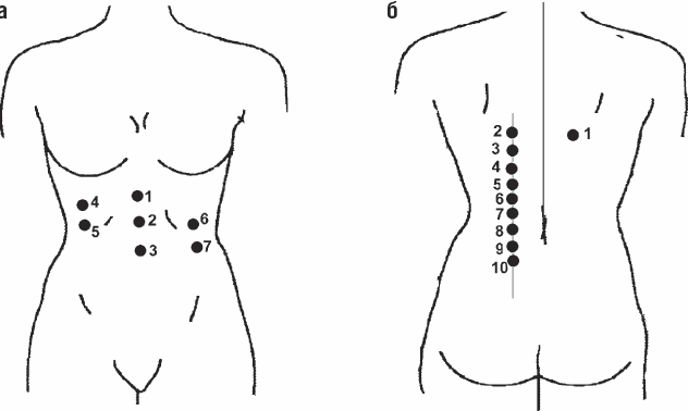 1. Лягте на пол, ноги прямые. Тремя пальцами (указательным, средним и безымянным) обеих рук надавливайте надчревную область (точка (1) на рис. 38, а). Выполняем надавливание трижды по 3 секунды.