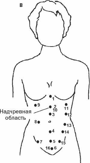 5. Надавливайте совмещенными большими пальцами поочередно на все точки, показанные на рис. 38, в (в соответствующем нумерации порядке). Порядок точек обусловлен строением желудочно-кишечного тракта. Обратите внимание: точка (2) совпадает с точкой (10), точка (6) совпадает с точкой (16). В точках (2), а также в точках (9) и (11) надавливание производится трижды.