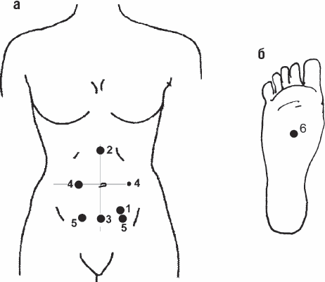 5. Точки (6), расположенные в середине подошвы, в углублении, образующемся при поджатии пальцев стопы (рис. 40, б).