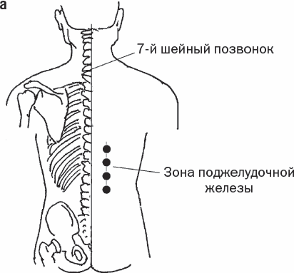 2. Опускаемся вниз на 10 позвонков. С обеих сторон от позвоночного столба можно нащупать тугоподвижную напряженную мышцу (рис. 54, а). Всю напряженную зону (слева и справа от позвоночника) необходимо надавливать кулаками или механическими массажером. Воздействие на эту зону улучшает функцию поджелудочной железы.