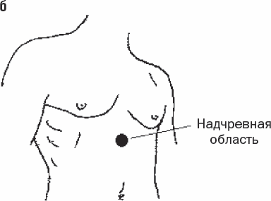 3. Затем надавливаем область надчревной зоны (рис. 54, б) двумя совмещенными ладонями в течение 5 секунд трижды.