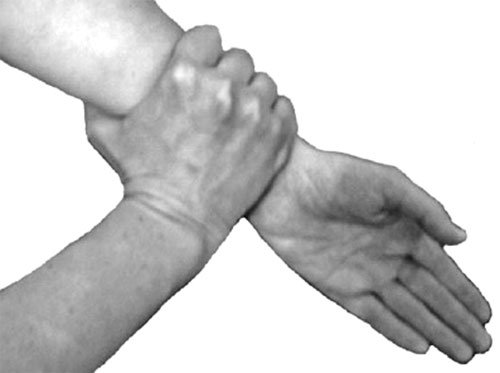 1. Раскрытую ладонь правой руки плотно кладут на пульс левой руки (то есть на внутреннюю поверхность левого запястья, фото 35). С хорошим усилием выполняют растирающее движение правой рукой вверх по левому предплечью и плечу – до подмышечной впадины. Потом перемещают правую ладонь на внешнюю сторону левого плеча и ведут правую ладонь вниз до левой кисти (плотно прижимая к коже).