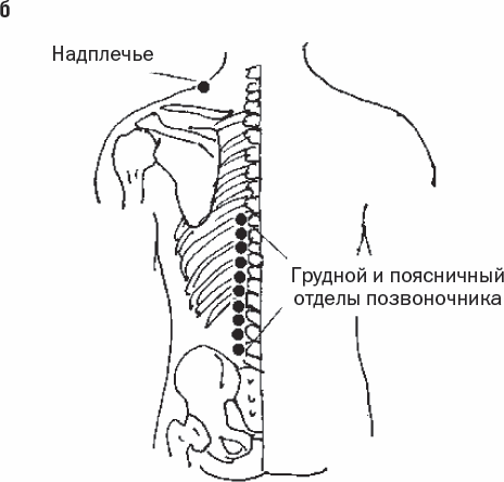 Точка отсчета – нижний уровень лопаток. От него вниз выделяем 10 точек (рис. 58, б), расположенных на расстоянии в два пальца слева и справа от остистых отростков позвонков (на горизонтали промежутков между позвонками, то есть на уровне хрящевой ткани).