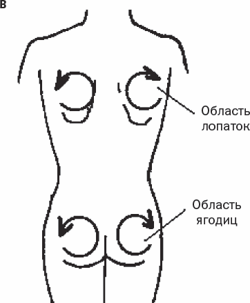1. Затем руки поочередно начинают плотное надавливание с одновременным вращательным движение в запястьях кнаружи от тела: правая ладонь вращается в запястье по часовой стрелке, левая – против часовой (рис. 58, в). Кожа на лопатках практически не сдвигается или сдвигается едва заметно! Давление книзу настолько плотное, что вращается не кожа, а мышцы под кожей. Сначала 3 надавливания-вращения выполняет одна рука, затем другая.