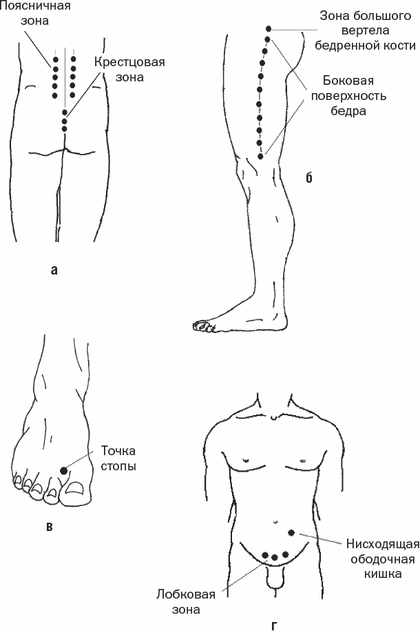 4. Надавливаем на бедра. Используем точки, расположенные выше большого вертела бедренной кости (рис. 5, б). Эти точки являются основными для успокоения слизистой оболочки кишечника и прекращения поноса; выполним 5 надавливаний на каждую точку длительностью 3 секунды.