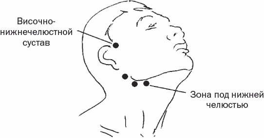 1. Надавливаем трижды по 3 секунды большим пальцем под нижней челюстью со стороны болезненного зуба (рис. 6).
