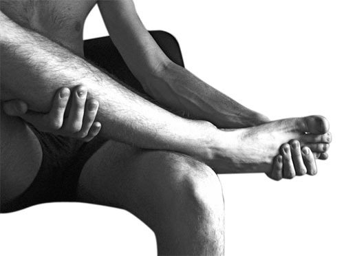 3. При ушибе голеностопа сгибаем больную ногу в колене и аккуратно растягиваем ее руками (фото 4): одна рука поддерживает ногу под коленом, другая плавно тянет голеностоп вперед, чтобы задействовать в работу всю голень («растянуть» голень). Такое лечение ускорит заживление тканей мышц и суставов.