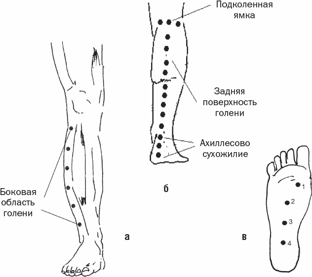 1. Вытягиваем ноги и сильно надавливаем большим пальцем на точки боковой поверхности голени (рис. 8, а).