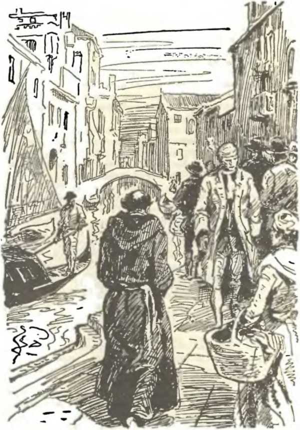 Джино вышел из дворца потайным ходом и очутился на одной из таких улиц. Он пробирался в толпе, запрудившей улицу, словно угорь, извивающийся среди водорослей лагун. На многочисленные приветствия друзей он отвечал лишь кивком головы. Гондольер очень спешил и ни разу не остановился в пути. Наконец он подошел к дверям маленького темного домика, расположенного в той части города, где ютилась беднота. Протискиваясь среди бочек, снастей и разного хлама, Джино на ощупь отыскал дверь и, толкнув ее, очутился в небольшой комнате, свет в которую проникал только через своеобразный колодец, образованный стенами этого и соседнего домика.